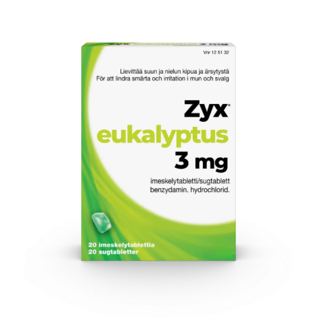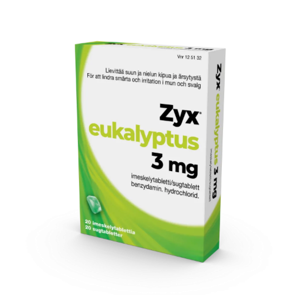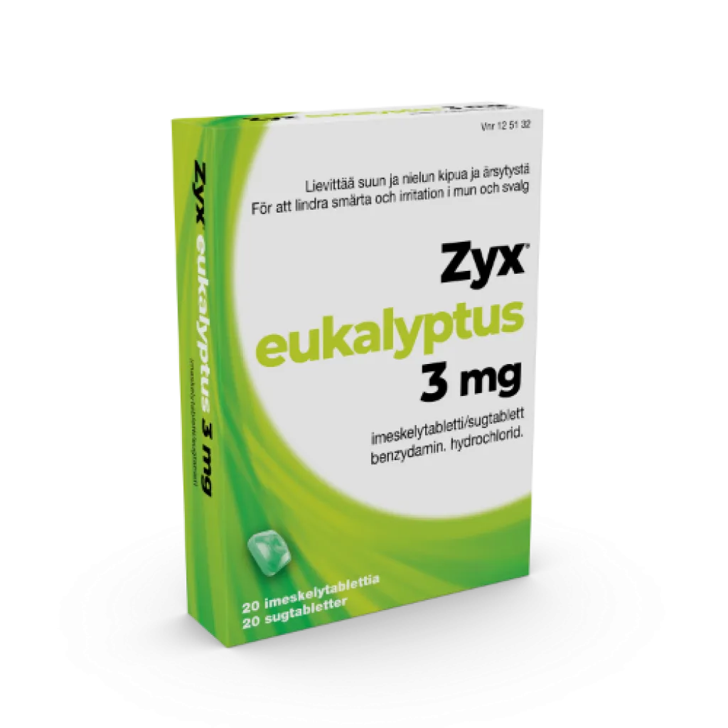 Eukalyptuksen makuiset Zyx-imeskelytabletit on kehitetty lievittämään tehokkaasti suun ja nielun ärsytystä, helpottaen oloa niellessä ja puhuessa. Niiden vaikuttava aine vähentää kurkun alueen epämukavuutta sekä puuduuttaa ärtyneen alueen hellävaraisesti.