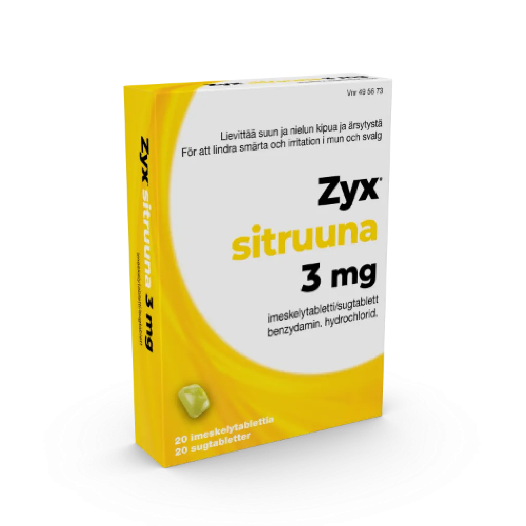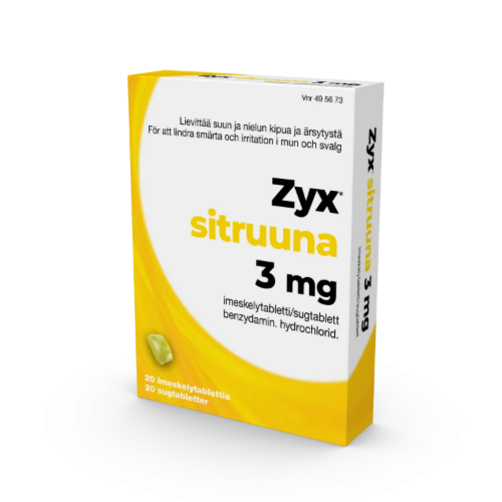 Sitruunan makuiset Zyx-imeskelytabletit on kehitetty lievittämään tehokkaasti suun ja nielun ärsytystä, helpottaen oloa niellessä ja puhuessa. Niiden vaikuttava aine vähentää kurkun alueen epämukavuutta sekä puuduttaa ärtyneen alueen hellävaraisesti.